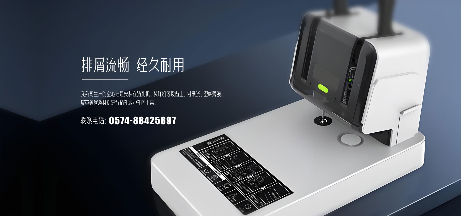本公司自建立以来,一直致力于空心钻的研制和生产。我公司生产的空心钻是安装在钻孔机、装订机等设备上,对纸张、塑料薄膜、皮革等软质材料进行钻孔或冲孔的工具。如财务装订、服装吊牌、笔记本、塑料袋等的打孔都要使用。